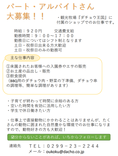 2023年9月1日 / 最終更新日時 : 2023年9月1日 dacho-oukoku お知らせ パート・アルバイトさん募集中!! ダチョウ王国のショップで働けるパート・アルバイトさんを募集しております! 詳細は下記の通りです。 FacebookXBlueskyHatenaCopy