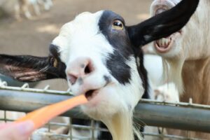 エサをあげるときは、動物の口がちょっと怖いのかもしれません。でも、動物たちは後ろを触られる方が怖いのです。やぎやひつじはとっても上手にエサを食べてくれるので心配ないですよ。草食獣の多くは、上の前歯がないので、ガブッと噛まれることもありません。